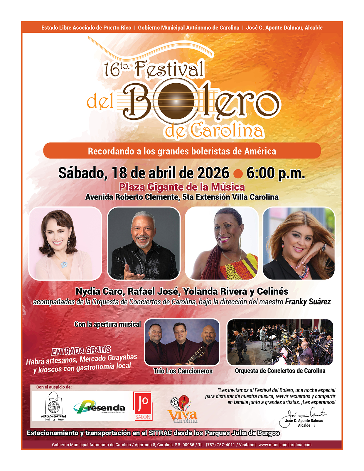 En la presentación musical estará Nydia Caro, Rafael José, Yolanda Rivera y Celinés acompañados de la Orquesta de Conciertos de Carolina dirigida por el maestro Franky Suárez.